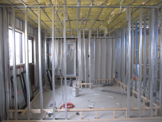 内装下地組の状況です、LGS(軽量鉄骨)で天井・壁共組んでいきその上に石膏ボードを張っていきます。