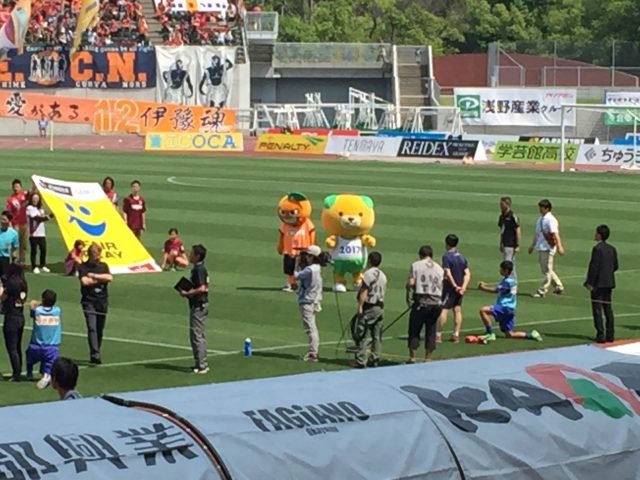 愛媛FC戦ということでマスコットキャラクターがきてました、今年は恒例のPK対決はなかったものの選手と一緒に入場です。