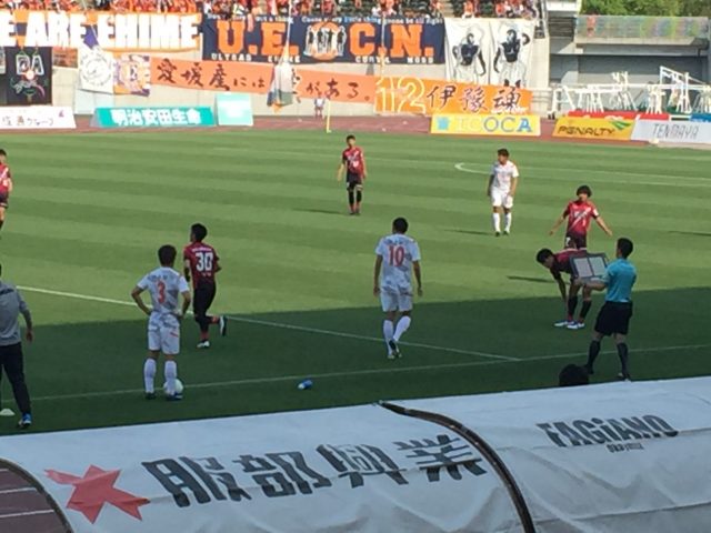 処で試合の方は、前半入り際からボールが落ち着かず愛媛がボールを持つ時間が長くなります。