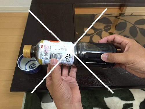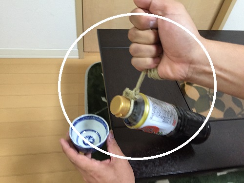 徳利に大体は紐が付いていますのでテーブルの端っこに徳利を持ってきてその紐を持って傾けて猪口?を注ぎ口に近づけて入れてください。