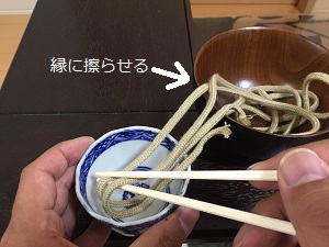 桶の縁にひっかけてというか縁に擦りながら器に入れましょう、そうすることによりお湯が縁で落とされてツユが薄くなりません。