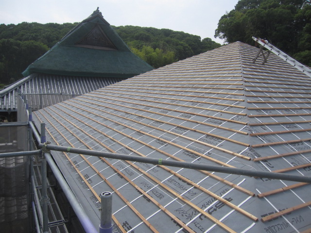 こんにちは、仏心寺礼拝所新築工事ですが今日は外部の屋根工事の方を紹介していきます。