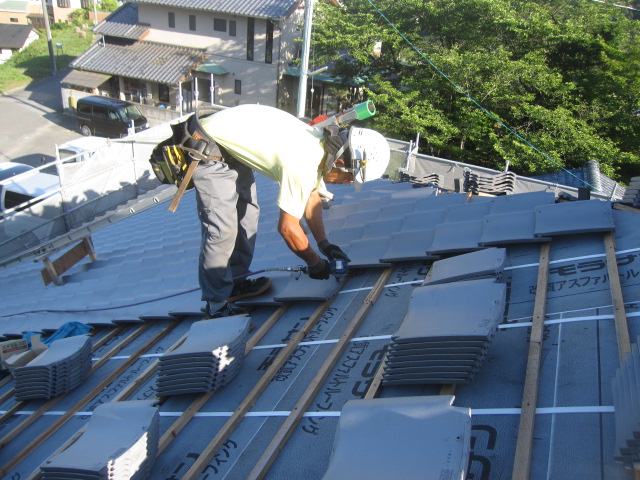そして瓦を水下から水上に向かって先ほど打った桟木に釘で留めていきます。