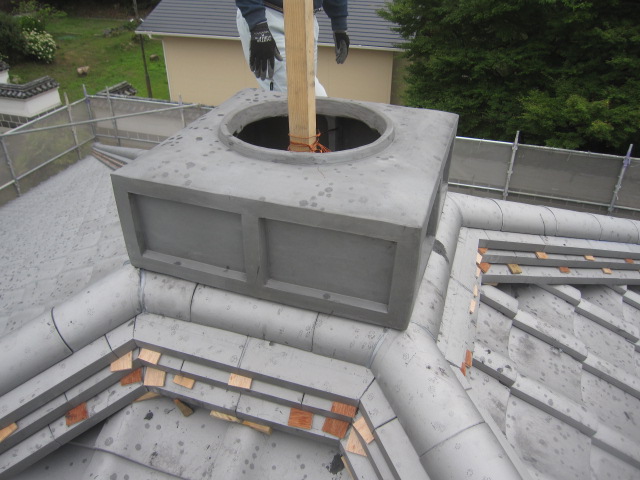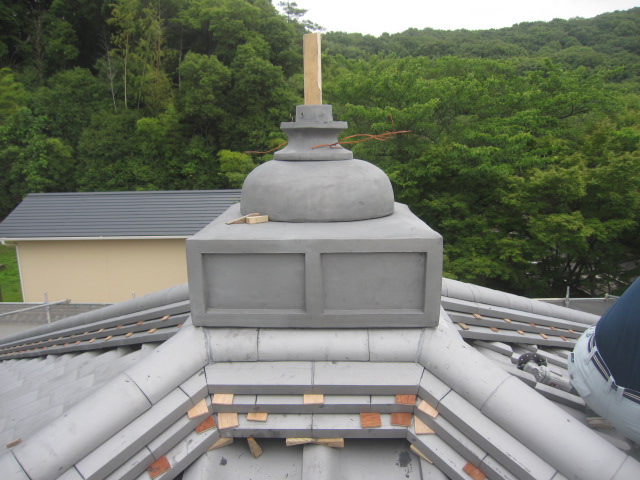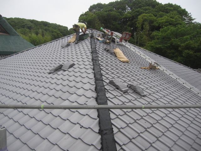 斜めの棟部分は瓦専用のしっくい材と銅線で瓦を固定して並べていきます。