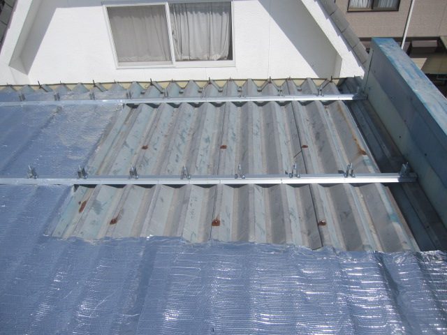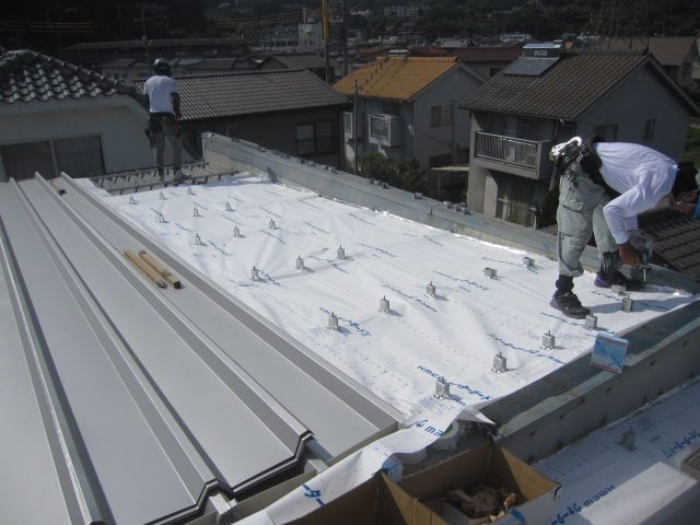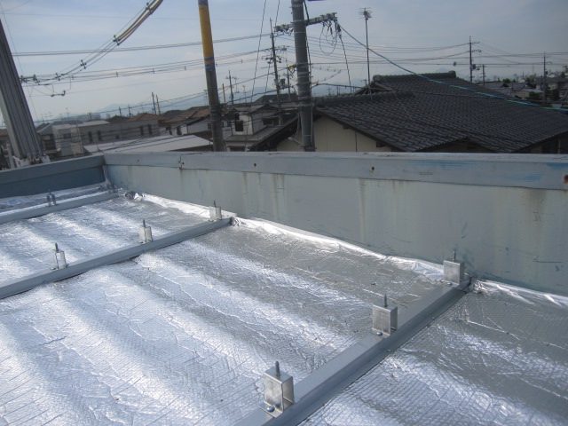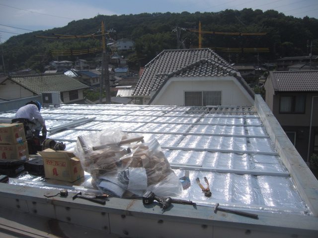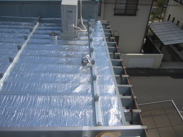 前回は既存屋根仕上材の上にリフレクティックスを貼りその上から下地をしていくところまで進み、次の工程はその下地の上から防水シートを張っていきます。