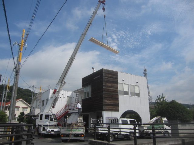 ▼その前に新設の屋根材をレッカーで荷上げします。