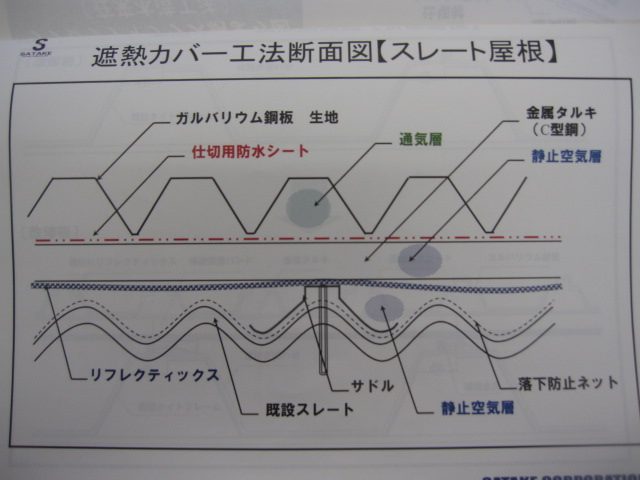 この静止空気層は外部から空気が入らないように仕切る必要があり、そのために上の図の赤点線のように防水シート等を貼り仕切っております。