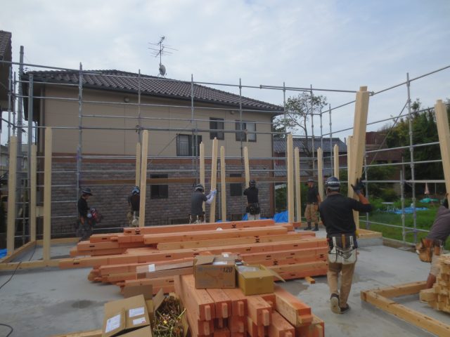 朝は7時に集合で棟上げに挑みます、小さな建物ですが大工さん7人での棟上げです。