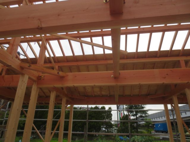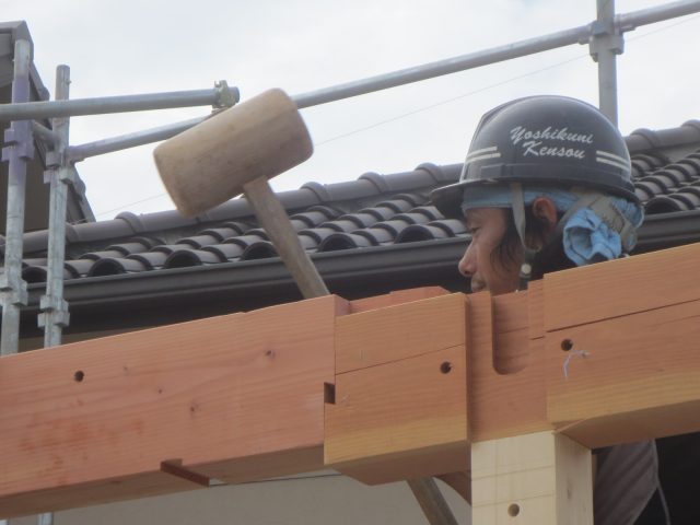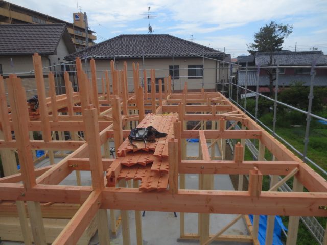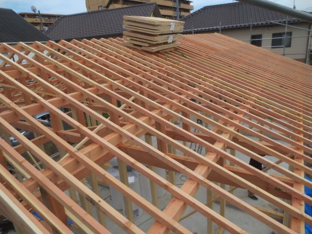 昼からは母屋の取付、垂木、破風板、野地板の順で各材料を手際よく取り付けていきます。