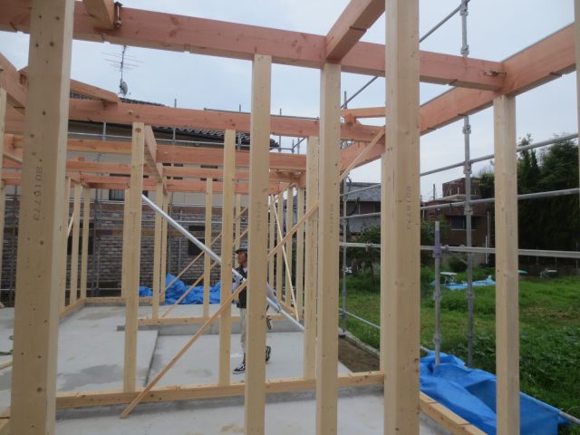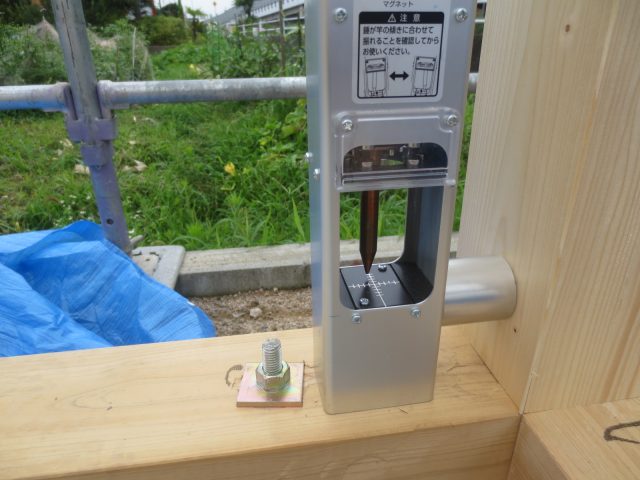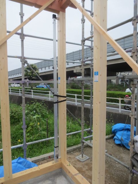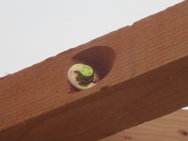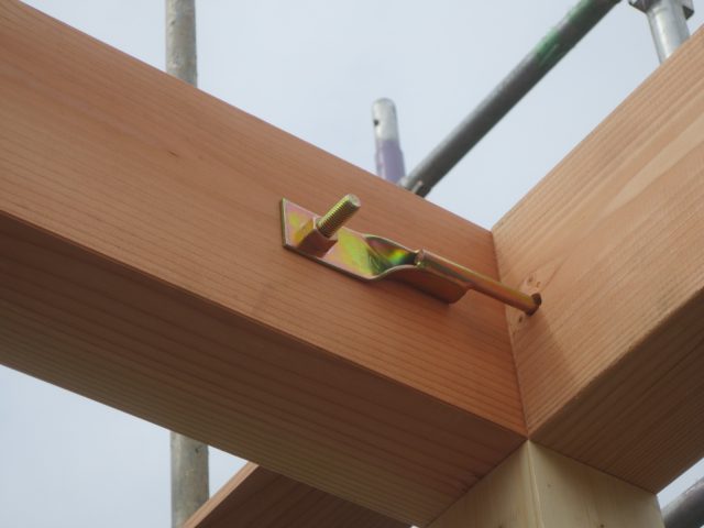 下げ振りで柱の垂直を確認して、緊結金物で柱・梁・火打ちなどを固定していきます。
