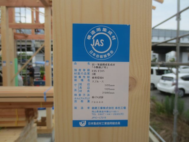 建物に使われている材料はちゃんとJAS規格適合の集成材で県北真庭で製作されています。