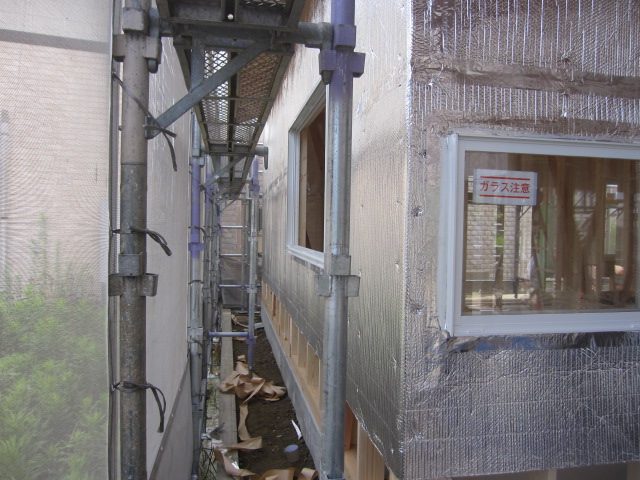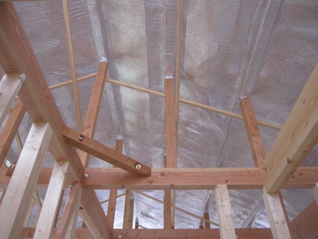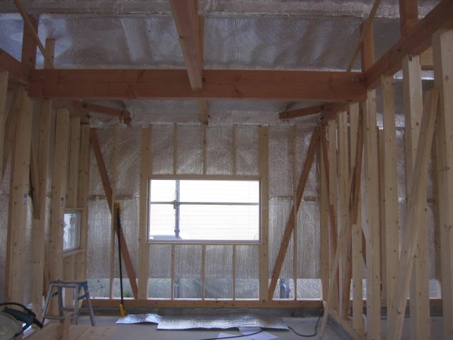 前回ブログで建方までが終わり現在は筋交い・間柱の取付・アルミサッシの取付と並行してリフレクティックス貼りを行っています。