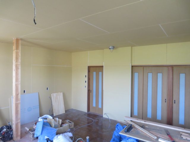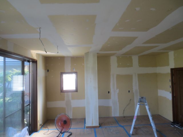 今日からは、壁・天井の幻の漆喰塗りの下地処理としてパテかいをしています、石膏ボードの繋ぎ目、ビスの跡をパテを塗りつけ乾けばサンドペーパーで平にする作業を2〜3度行います、そうすることにより真直ぐで平らな下地が完成します。