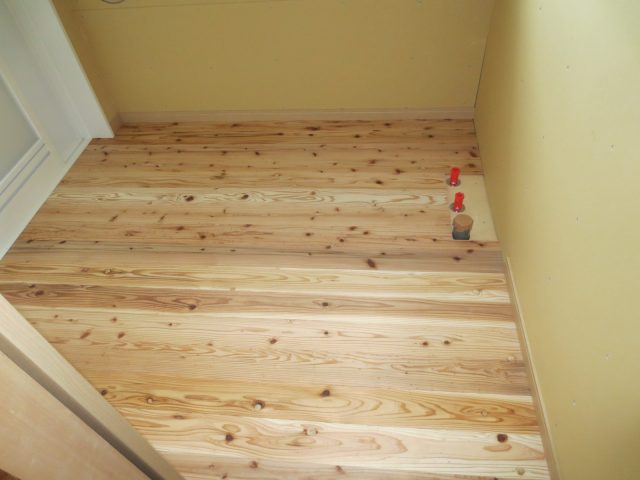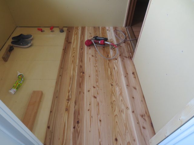 音響熟成木材の杉板も洗面脱衣場の床に貼りました、ユニットバスは完成しているのでお風呂は先週より使って頂いており、水の染み込みが心配でしたが、カイケンコーポレーションの説明通り染込み跡なども無く綺麗に保てていますね。