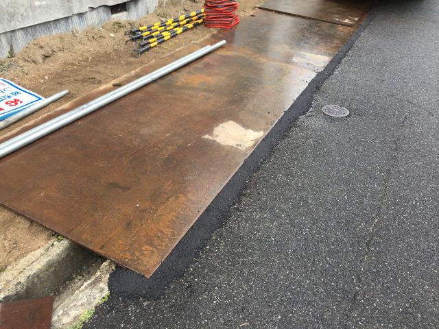 側溝が壊れないように鉄板を敷いて、鉄板と道の段差は危ないので簡易アスファルトで段差をなくしています。