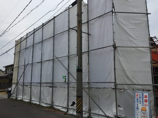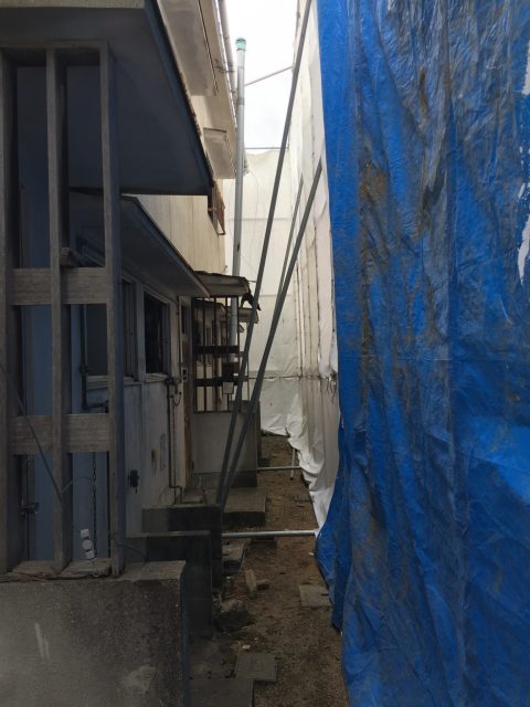 お隣にゴミや破片、埃などが散らないように、キチンと養生を行います、風などで倒壊しないように控えを取ります、控え単管は杭を打って緊結しています。