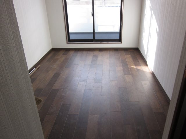 1階の床塩ビタイルはダークブラウン系の色で2階はホワイト系の塩ビタイルになっています。
