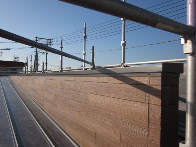 ▼外部の方ですが屋根のパラペット部分の笠木の取付や樋の取付が完了しました。