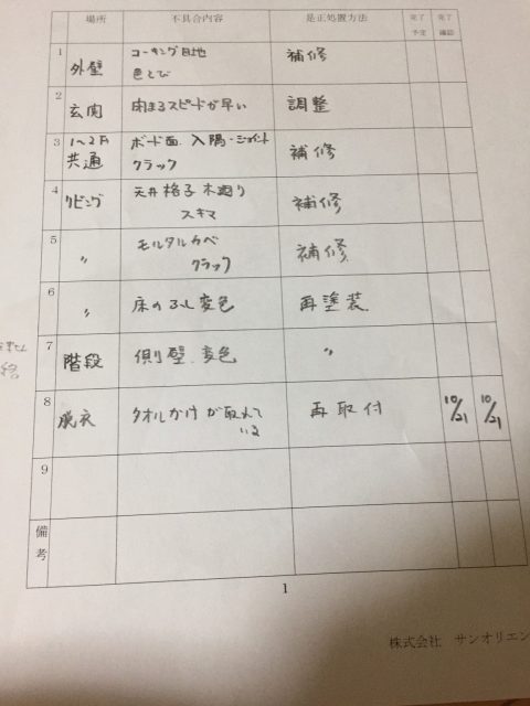 外部の指摘は吹き付けリシンの際の色飛び、タッチアップして見て目立ち具合を検証することにしました。
