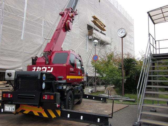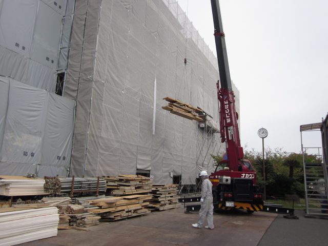 来週からは2階の型枠建込みに入っていくため今日2階の型枠材を搬入、レッカーで荷上げしました!