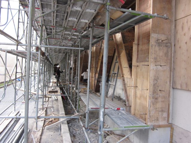 今回の工事ではピタコラム取り付き箇所が4階まであるので仮設足場に荷取りステージを設置して上の階の材料はこのステージに荷上げしてから足場の中へ取り込んで行きます。