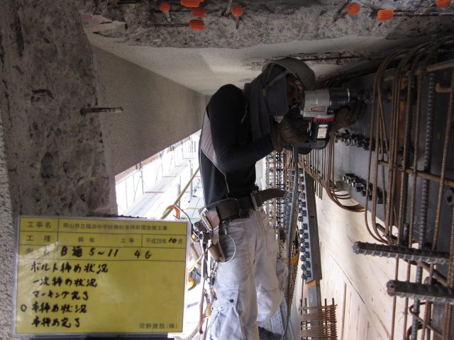 ▼鋼板の建て入れ調整が終わったら継手部分のボルト締めを行います。