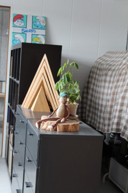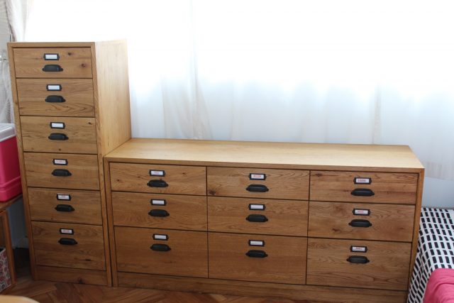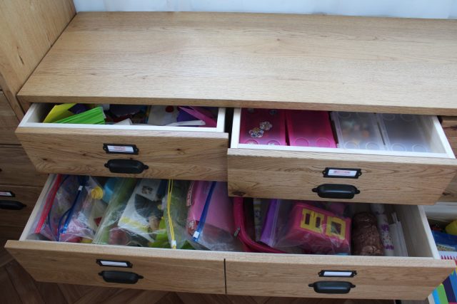オークの無垢材でできていて、高級感があり、引き出しがたっぷりあるので、おもちゃを分類してしまえます。