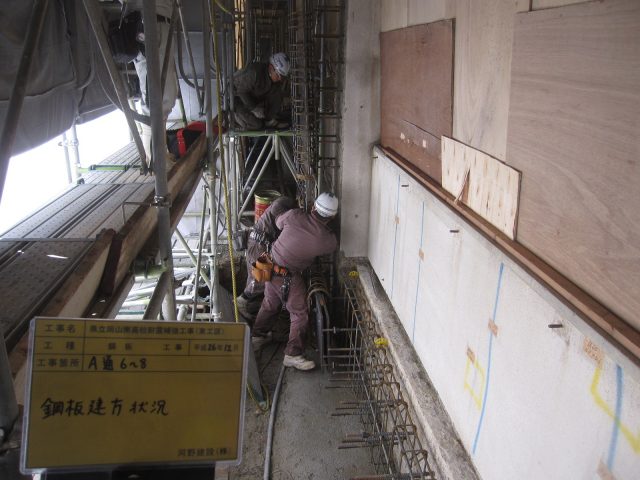そしてこの打設したアンカーに工場で穴あけ加工してきた鋼板をはめ込みます。