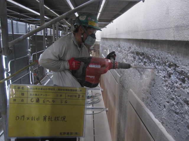 ▼アンカー孔あけ作業の状況です(穿孔作業時は粉塵を吸い込んだりしないよう保護具着用徹底!で作業します)