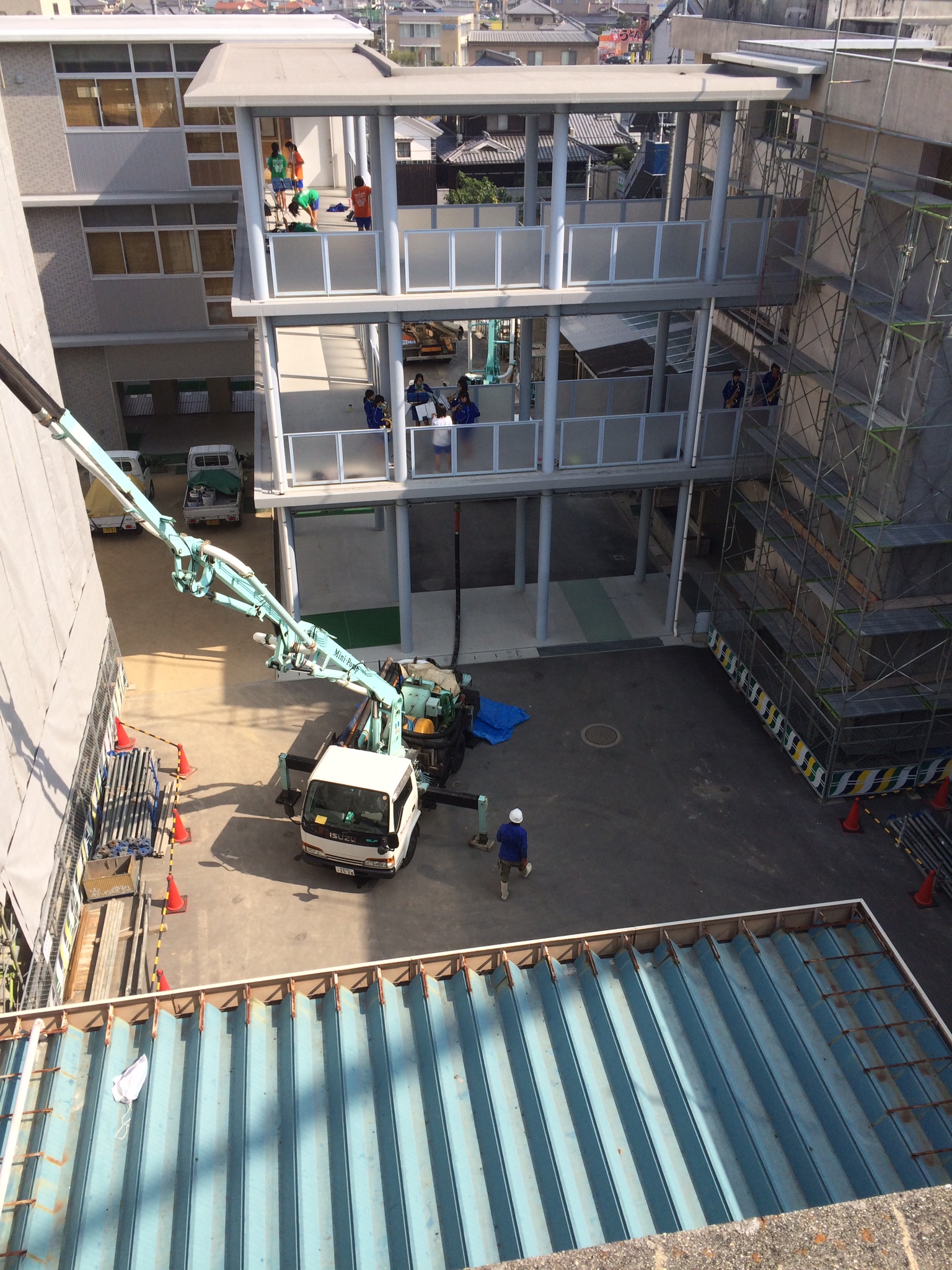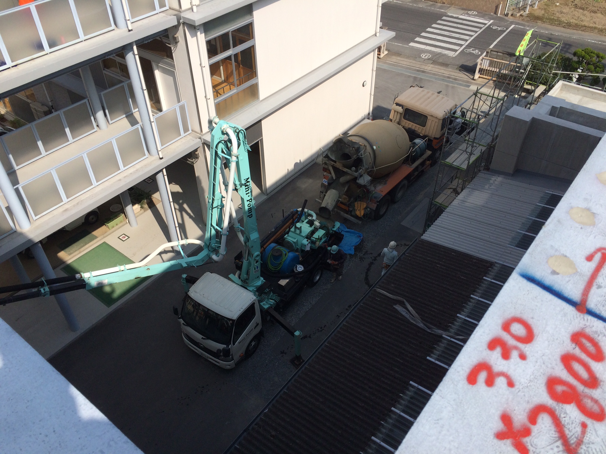 生コン車が入っていけない所もあり、ポンプ車2台を駆使して生コンを送るという技を披露していました。(当社担当 丸尾)