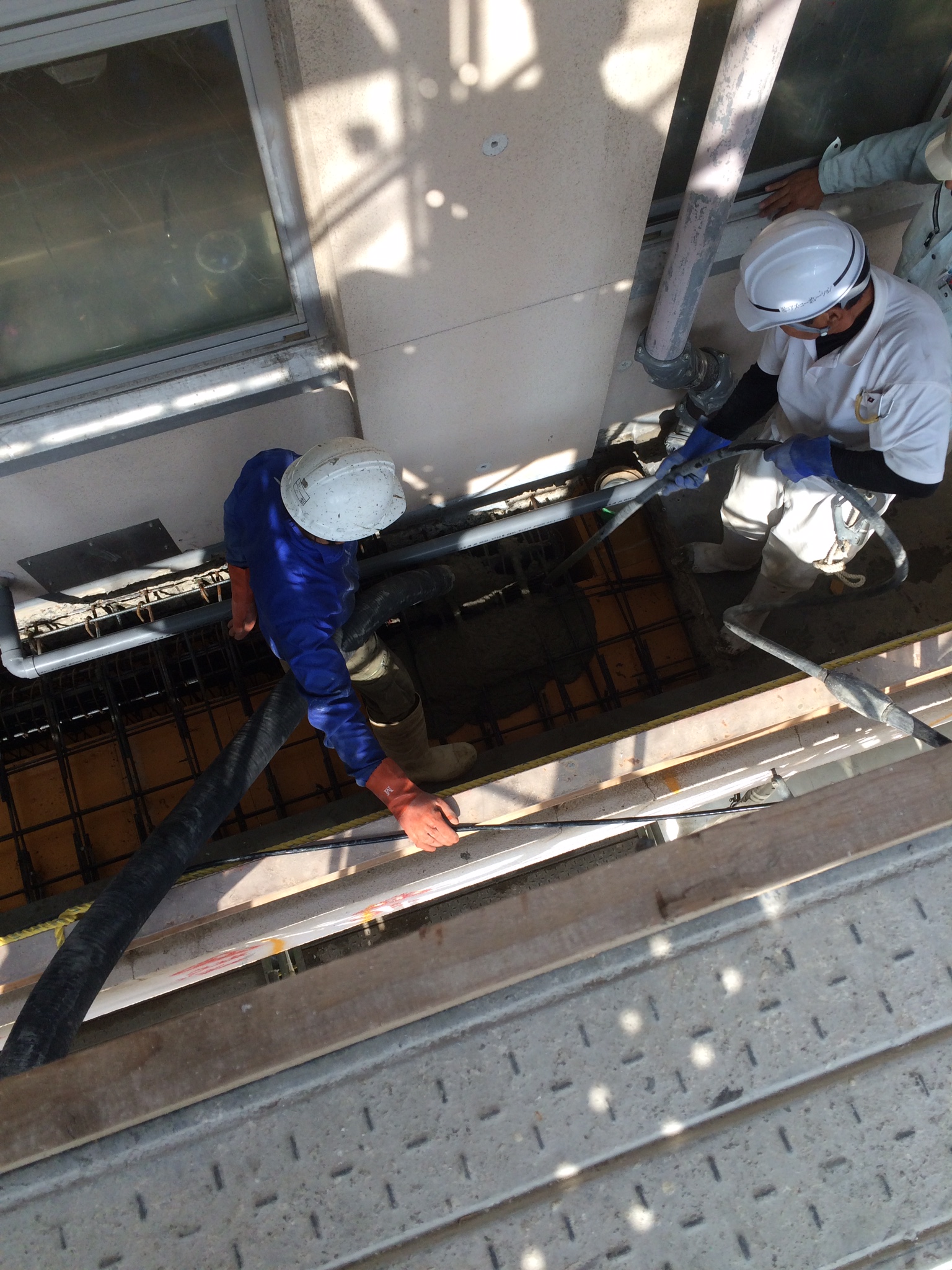 この写真は生コンを型枠内に流し込んでいる場面です。
