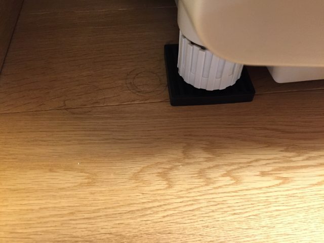 防振ゴムを洗濯機の足の下に敷いて、念のためつっかえ棒を取り付けました、試運転してみると結構揺れますが移動することもなく完璧な仕事でした。