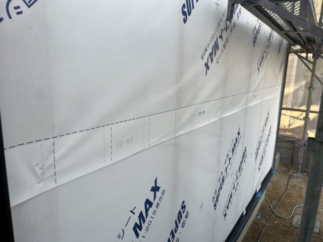 サイディング部分とジョリパット仕上げのところでは、透湿・防湿シートは違うものを貼ります。なぜなら、この上からモルタルを直接塗るので、アルカリ(モルタルは強アルカリ性)に強く作られているシートを使うのです。