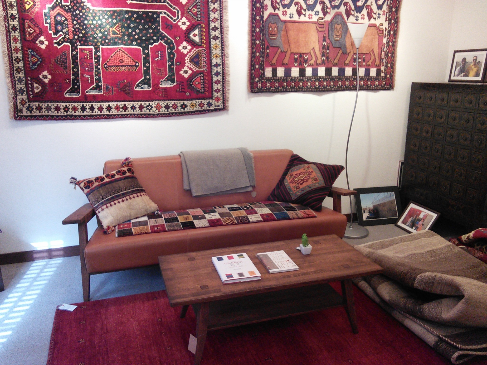 ↑ギャッベでコーディネートされた落ち着く空間です。クッションカバーもあります。