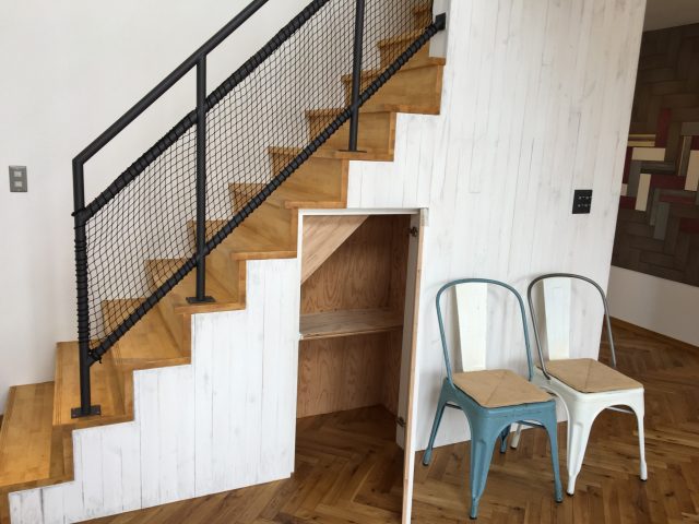 階段下のスペースも無駄にせず、収納として使いますが扉は壁と同化させ隠し扉でスマートに(^_-)-☆