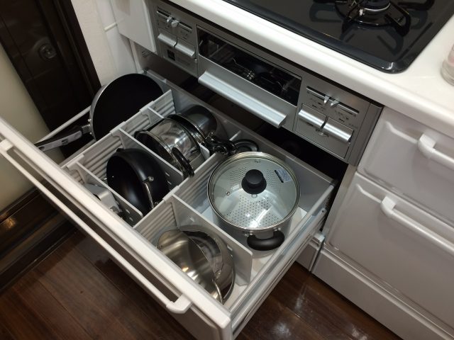 ▼引き出しの中の仕切りも磁石でしっかりとくっついているので、グラグラしないし、アレンジ自由自在!お鍋の大きさにも柔軟に対応できるので、市販の収納グッズより、断然こっちのほうがオススメです。