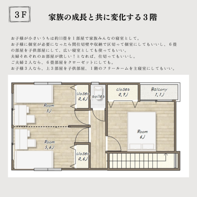 はじめから個室3部屋だと、家族構成や暮らし方に柔軟に対応できないと考えて、10.6畳の1室と6畳の1室にしています。