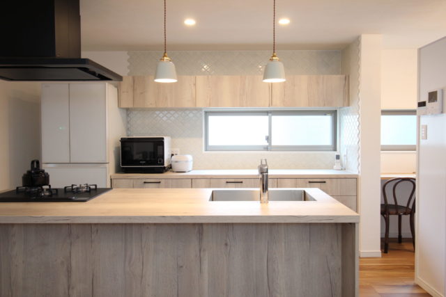 琺瑯独特のぽってりとした光沢のあるecruという色。グラフテクトのキッチン(ノッティホワイト)、サンワカンパニーのタイル、リッコモザイクアラビッククリームとの組み合わせも優しく温かい印象です。