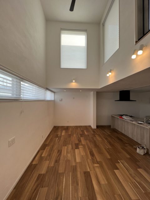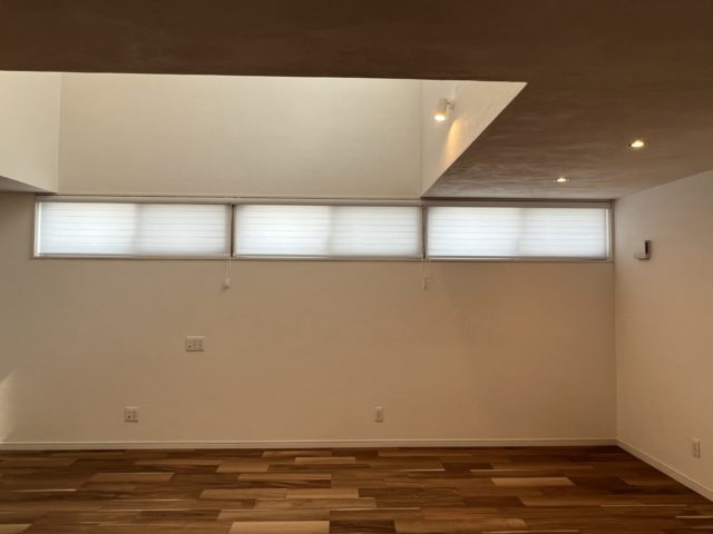 計画段階では、カーテンブラインド等なしの予定だった吹抜けと横長の窓に