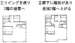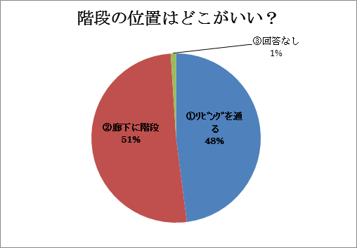 これは、半々ですね。「子供がこっそり部屋に入らないように、家族と顔を合わせる時間が増えるように」という考えから10年くらい前から人気になっている「リビング階段」。欠点としては、リビングの空調がききにくいってことで、避けられる方もいらっしゃいますが、ロールスクリーンをつけたり、ちょっとカーテンをかけるだけでも空調のききは違うんですよ♪工夫次第です。