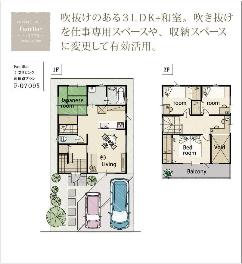 3LDKに和室のある充実した間取りのあるプランです。吹き抜けを仕事専用の部屋や、収納部屋に変更することも可能です。