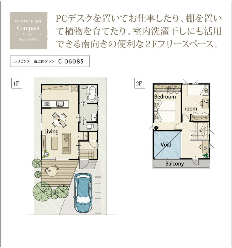 今回ご紹介する間取りは規格住宅(コンセプトハウス)の中のひとつ、、家にかけるお金は最小限に、自分らしいこだわりのある家、建坪15坪以下の Compact ~コンパクト~ です。