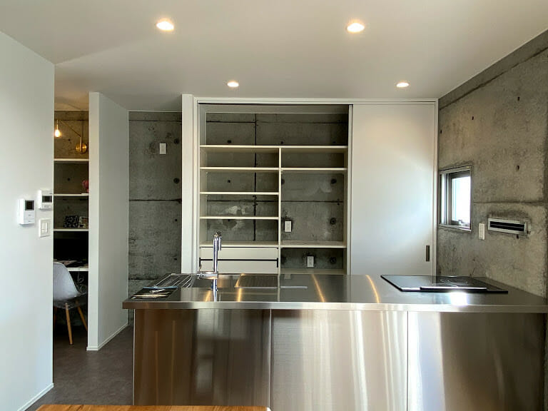 サンワカンパニーのステンレスキッチン。食器棚と家電収納は扉で隠せます。