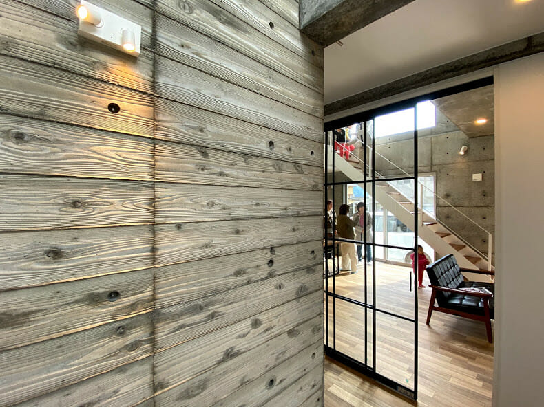 入ると正面に杉板の打ちっぱなしです!美術館みたい