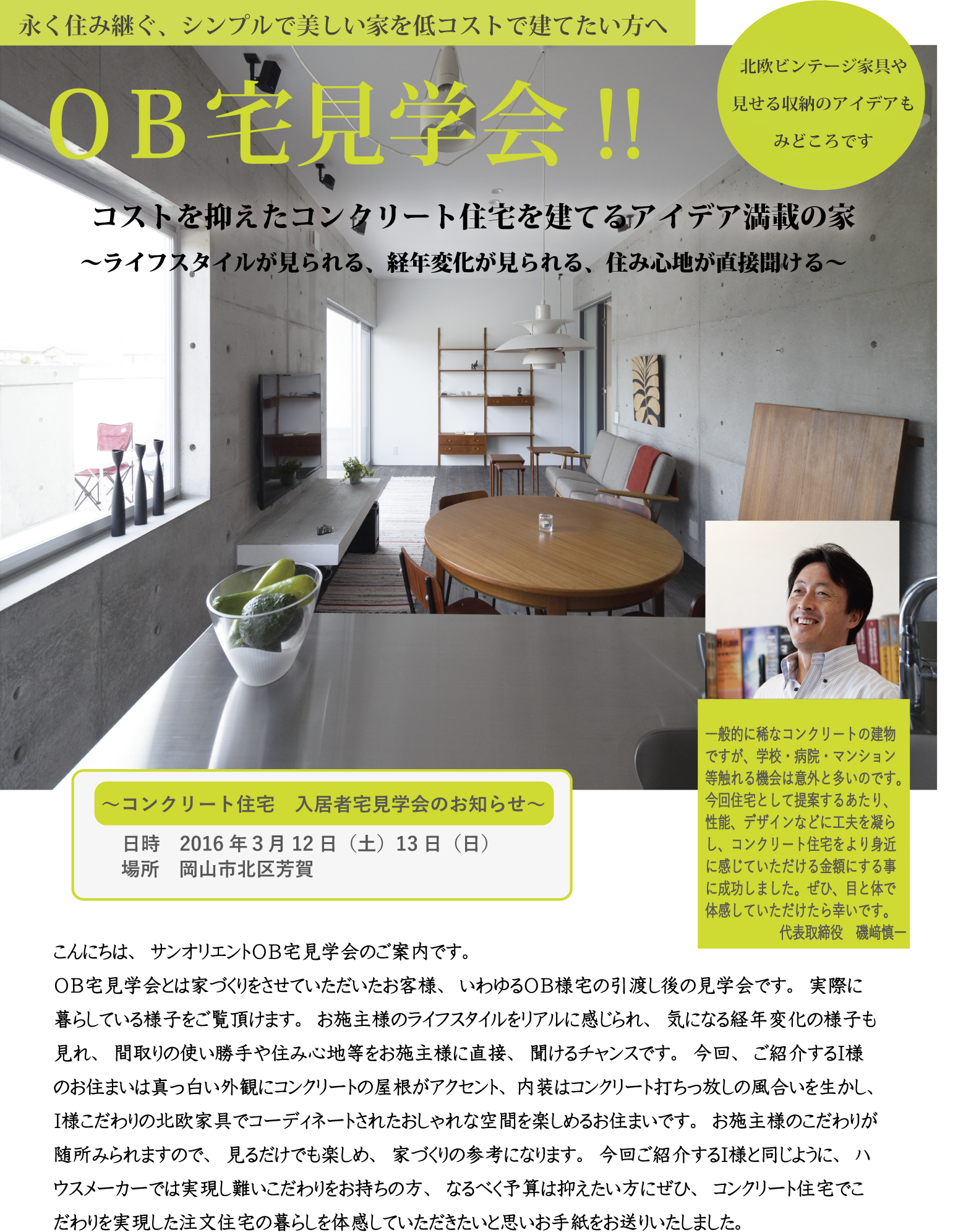 あと、2016年3月12日(土)・13日(日)に岡山市北区芳賀でRC住宅のOB宅見学会を行います☆