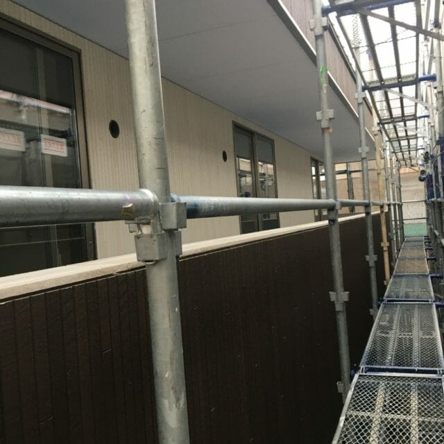 【バルコニーの手摺はダークブラウンの木目ストライプを竪使いに】