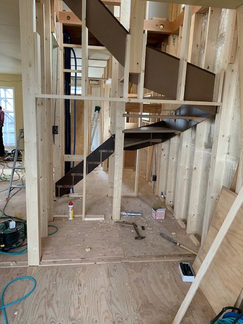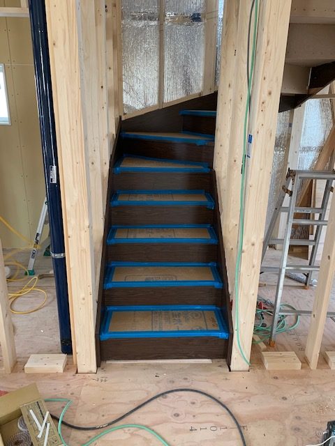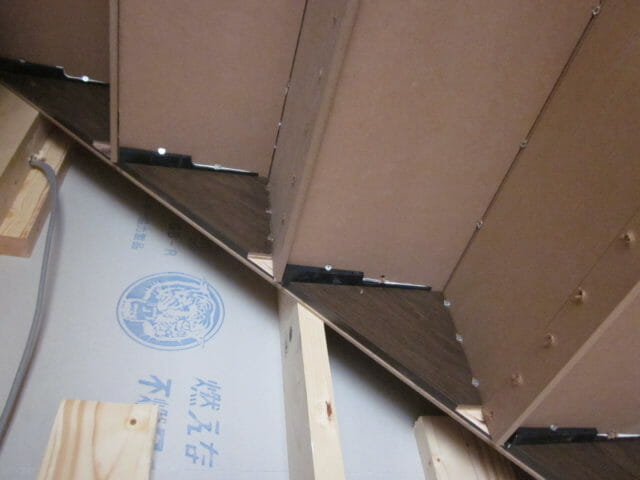 こちらの階段はあらかじめ工場でプレカット加工してきており、階段側板の欠き込みに踏板と蹴込み板をはめ込みクサビにより仮固定しボンド+ビス留めにて現場組立を行っていきます。