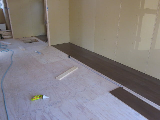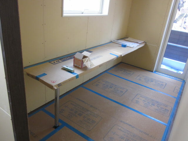 フローリングは張り終ったらすぐにキズ防止の養生材を敷くので分かりにくいですがこの下にフローリングが張ってあります。