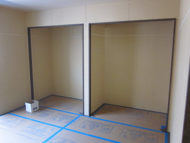 ▼2階の方は天井・壁ボード貼り・建具枠の取付・床フローリング張まで完了しています。