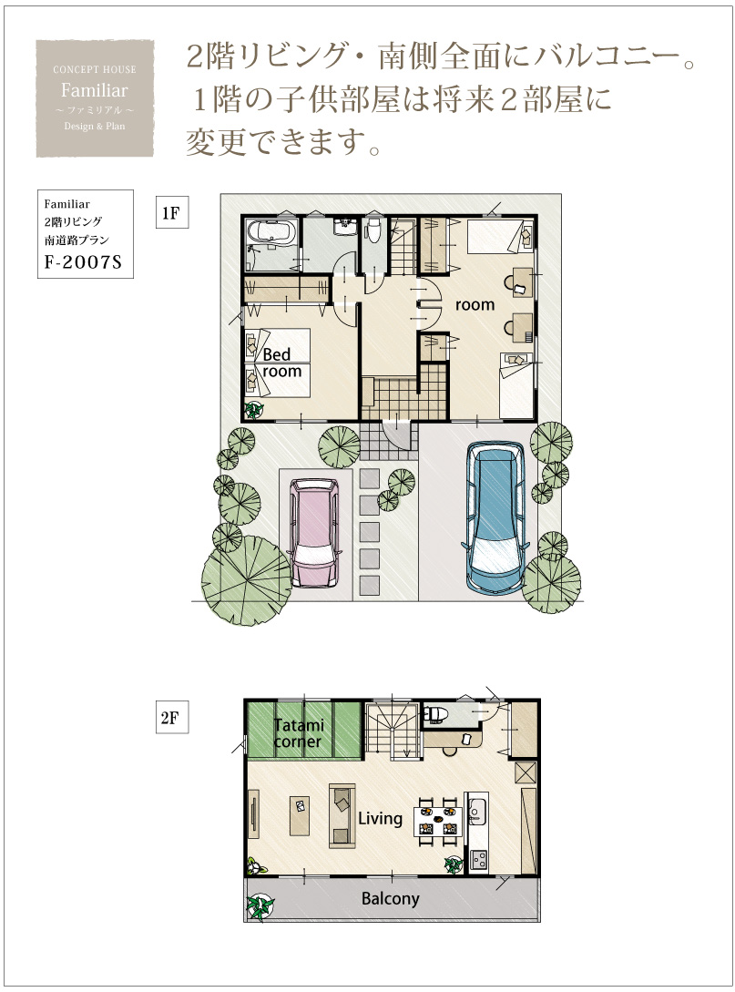今回ご紹介するのは 2階リビングには畳コーナーがあり、バルコニーが南側全面に面しているため、陽当たり良好です。また、1階の子供部屋は将来2つに仕切れる造りになってます。